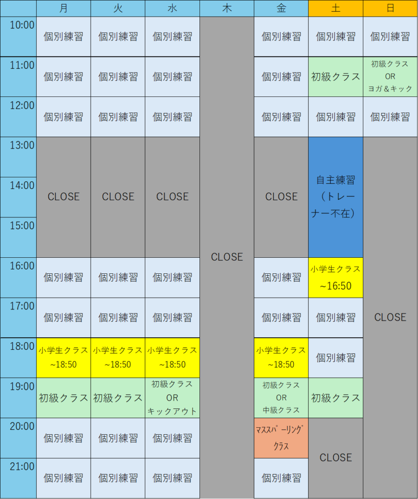 ・中級クラス(現役プロファイターによる実践的な練習。技術の向上を目指す)金曜19時、月1回